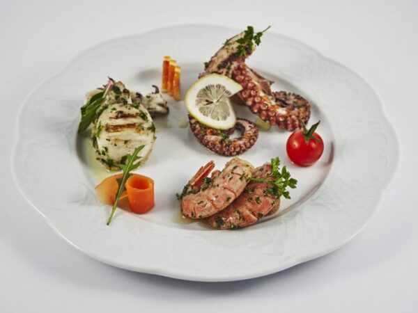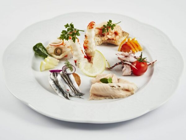 Cocktail di gamberi, alici marinate, salmone marinato, carpaccio di totano, surimi al sapore di gambero e insalata orientale: il meglio del mare per arricchire la vostra tavola.